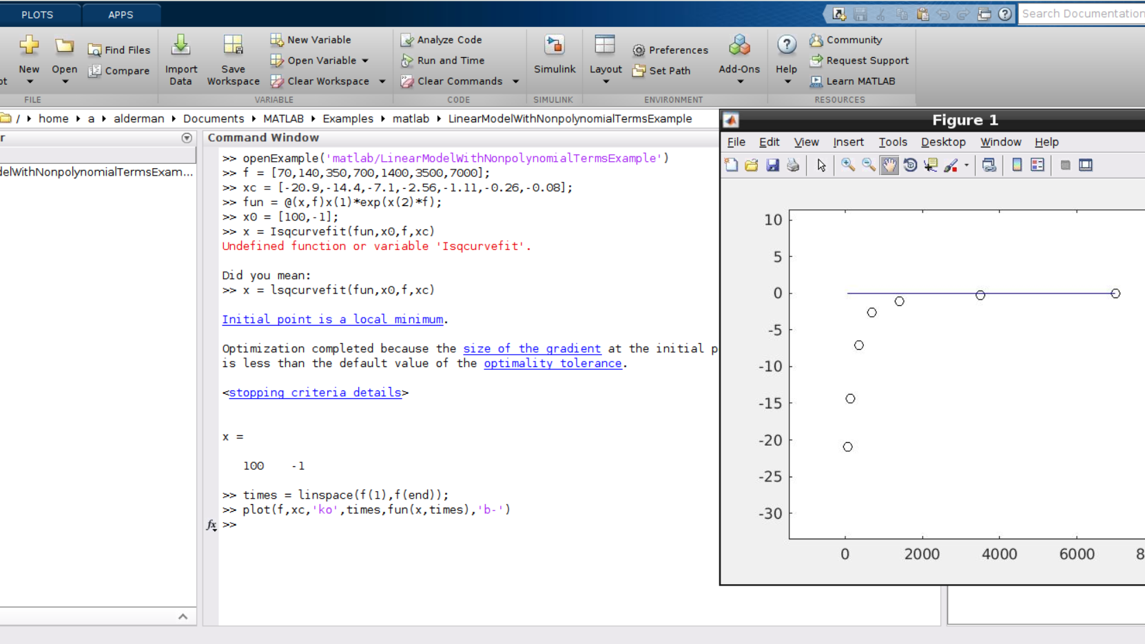 Habe es gerade mit dem Code nur schnell im Command window versucht, aber er plottet die Kurve nicht, hänge einen screenshot dazu, damit es verständlicher ist und mir vielleicht wer meinen Fehler zeigen kann.