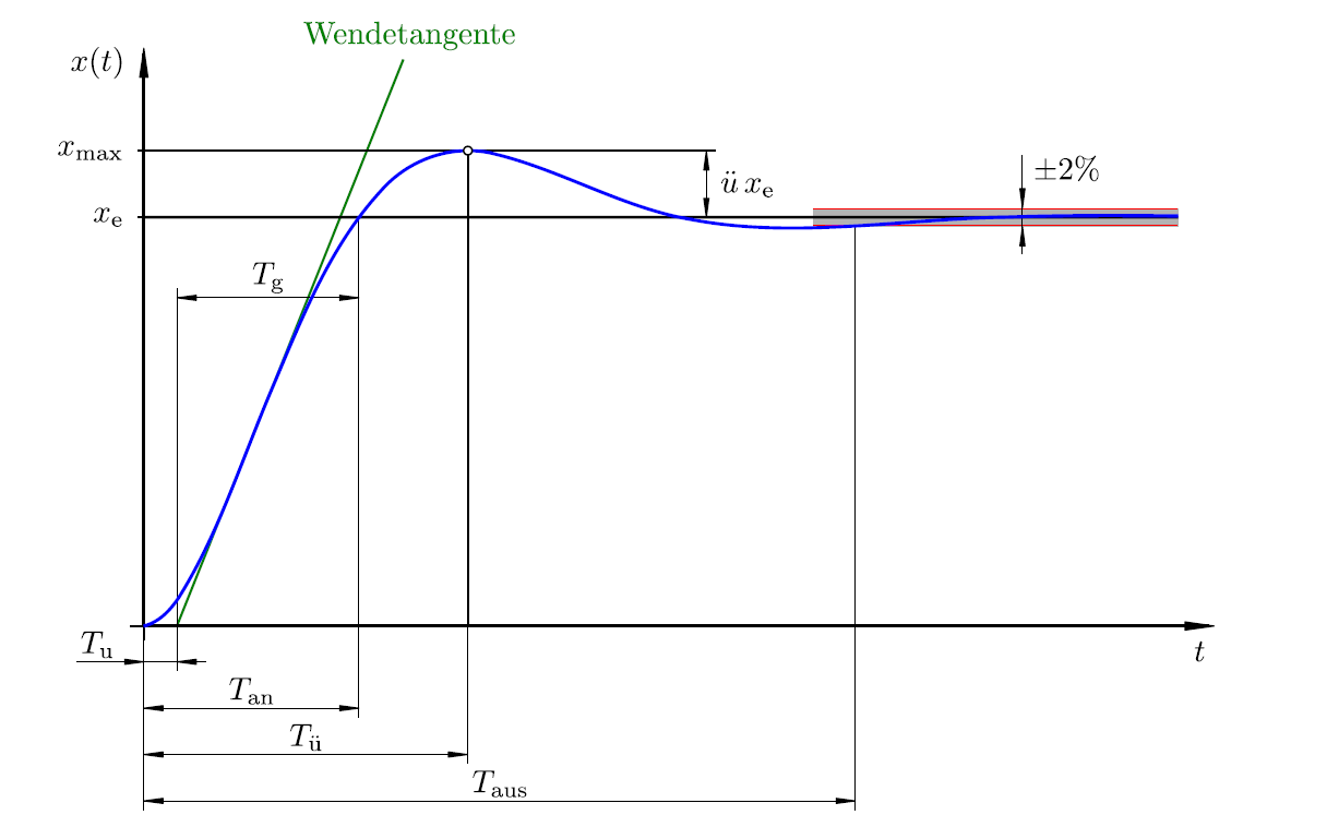 Die Ausregelzeit bestimmt sich dadurch, dass der Kurvenverlauf dauerhaft innerhalb eines Toleranzbandes (rot dargestellt) verbleibt.