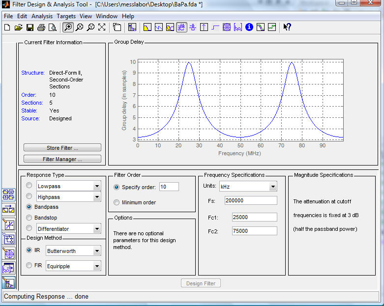Genauer gesagt, ich muss 3 verschiedene Bandpassfilter in Matlab erstellen mit einer Bandbreite von 50MHz.