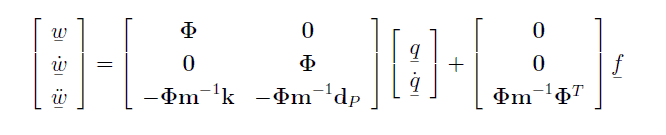 Anders ist es aber bei der Beschleunigung (im Bildanhang die dritte Formel), da ich im modalen Raum ja nur modale Strecken und modale Geschwindigkeiten verwende. Die Lösung für den Output ist die Transformationsmatrix Phi zweimal in der Diagonalen in C, aber es muss noch der Input mit der Eingangsmatrix B hinzuaddiert werden. (Bitte die Formeln anschaun, ich denke, das ist leichter zu verstehen als meine schriftliche Beschreibung).