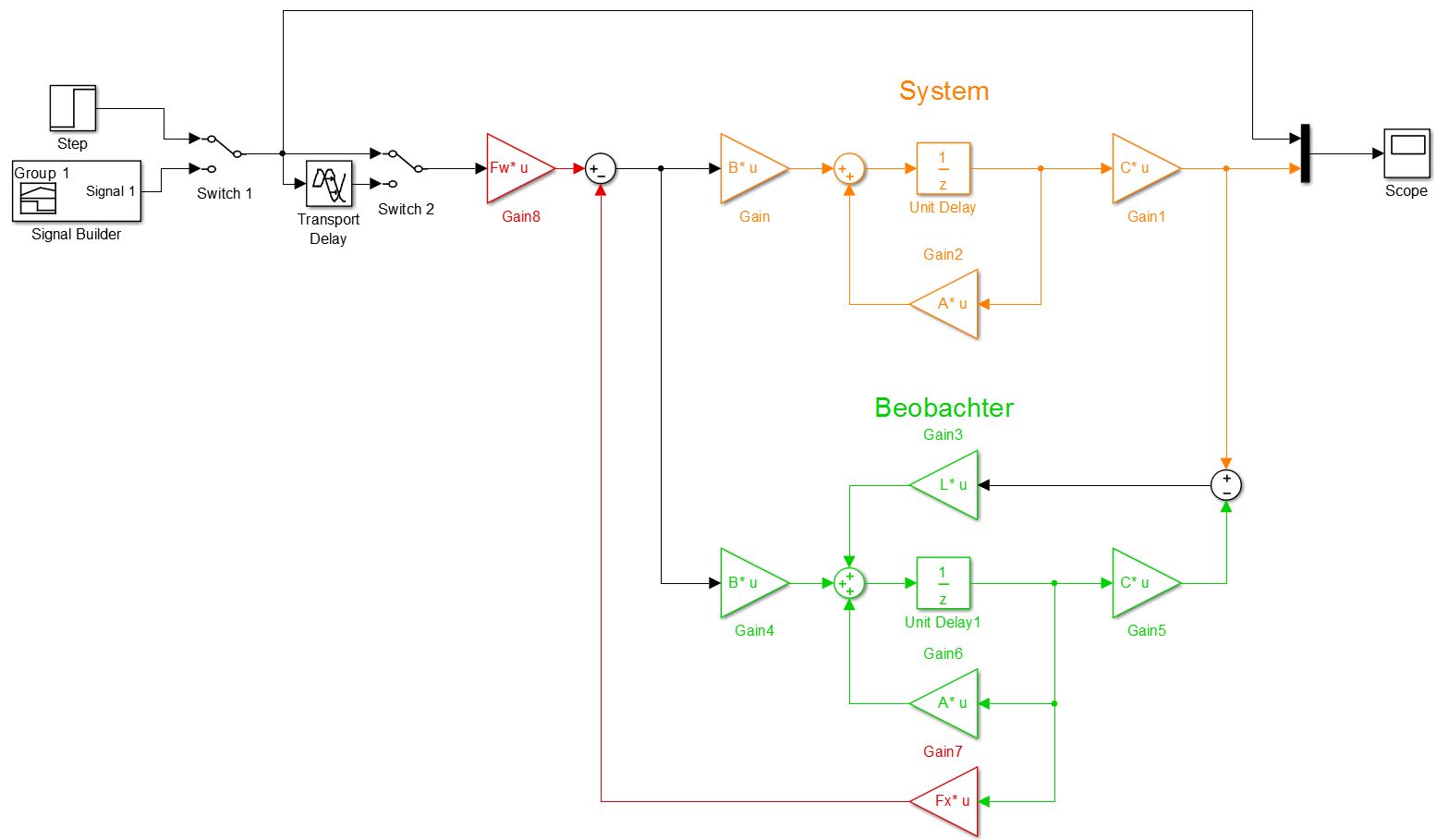 ich beschäftige mich zurzeit mit der mit der P-Zustandsregelung mit Beobachter( Vollständiger Identitätsbeobachter oder auch luenberger Beobachter). Ich entwerfe im Kontinuierlichen mit "acker" den Beobachter und mit "lqr" den P-Regler. Anschließend berechne ich den Vorfitler und es läuft. Die Regelung sieht super aus im Zeitbereich. Jedoch will ich jetzt alles auf den z-Bereich konvertieren. Mit "c2d" kann ich mein Zustandsraummodell in den z-Bereich rüber holen. Jedoch ist meine Frage wie ich die Beobachter Matrizen speziell "L" in den z-Bereich hole. Die Regler Matrizen "Fw" und "F"x müssen auch konvertiert werden...oder? hat jemand eine Idee wie ich das schaffe bzw. da vorgehe?