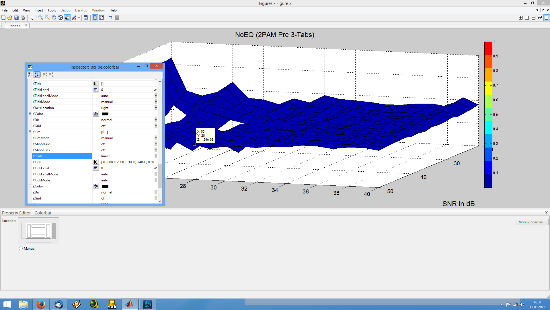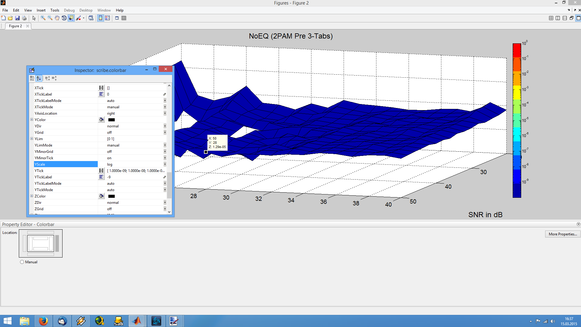 Ziel: Bit Error Rate 3D Plot (SNR und Baudrate als Grundlage) mit einer log colorbar. Ich nutze derzeit Matlab 2014a. Was ich gerne möchte sind gut erkennbare farbliche unterschiede zwischen sehr kleinen zahlen.