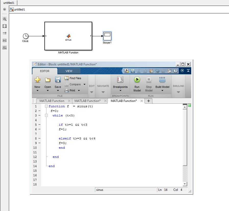 Der m-file Block soll abhängig von der Zeit Ausgaben bringen. Die Zeiten sind bekannt, jedoch im Mikrosekunden-Bereich. Ich habe nur den Clock Block gefunden, der mir eine Referenzzeit liefert. Simulink hat dadurch aber keinen Dauerzustand und die Zeit t bleibt bei der Berechnung konstant 0.