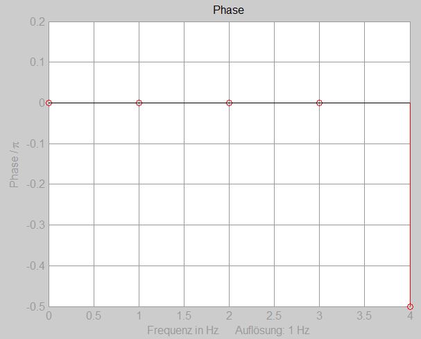Wird für die Cosinusfunktion eine Frequenz gewählt, die zwischen den Frequenzstufen liegt, wird für alle Frequenzstufen eine Phase mit einem Wert ungleich 0 angezeigt.