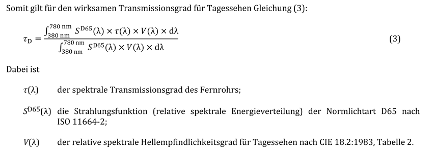 | Formel nach DIN 14490-5 für den spektralen Transmissionsgrad bei Tag |