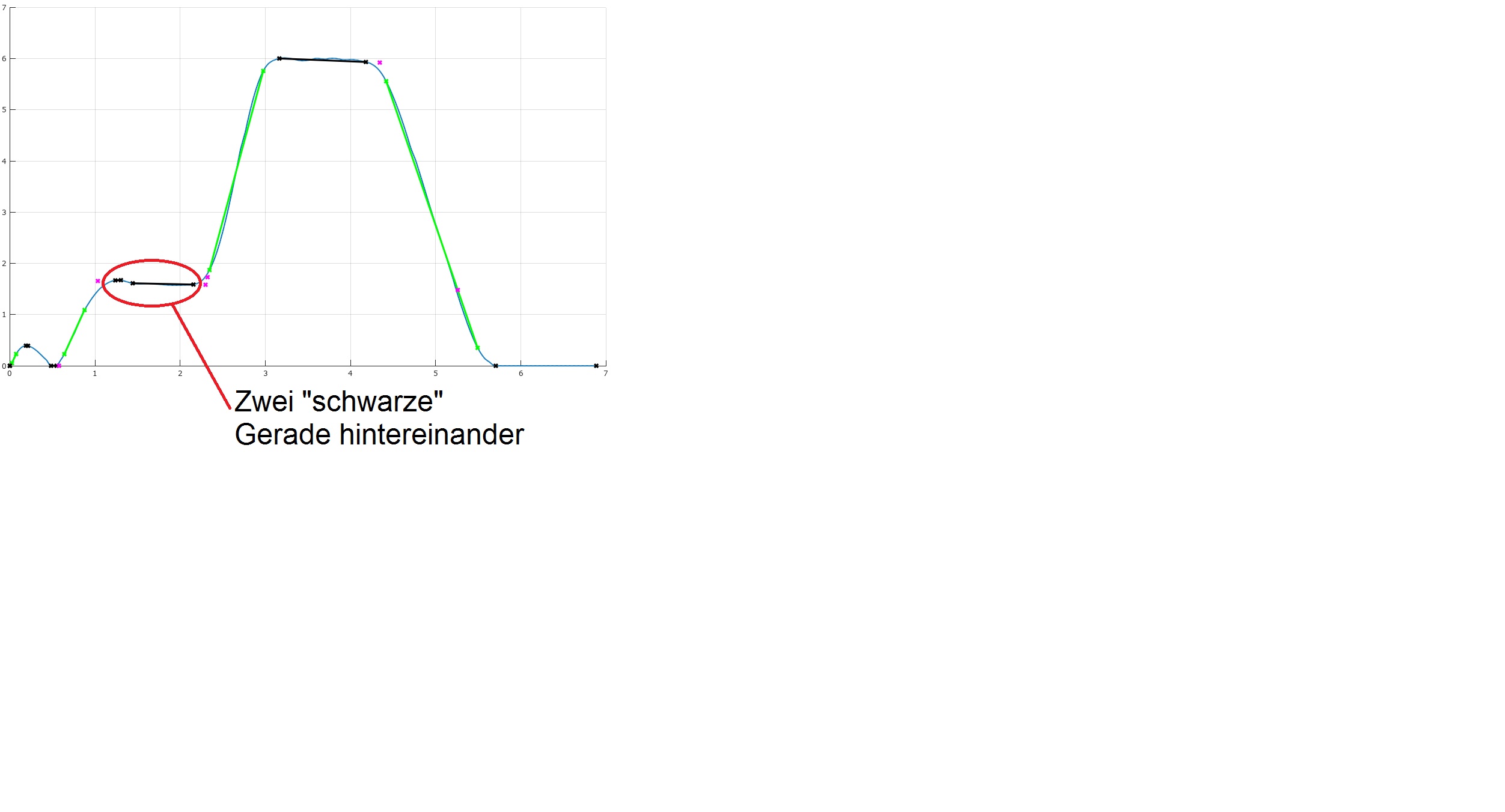 ich lasse mir in einem Kurvenverlauf Geraden in der Steigung(grün) und Geraden im konstanten Bereich(schwarz) erstellen. Da diese Geraden verschiedenen Bedingungen unterliegen, ist es möglich, dass zum Beispiel zweimal hintereinander eine waagrechte/konstante vorkommt (siehe Anhang).
