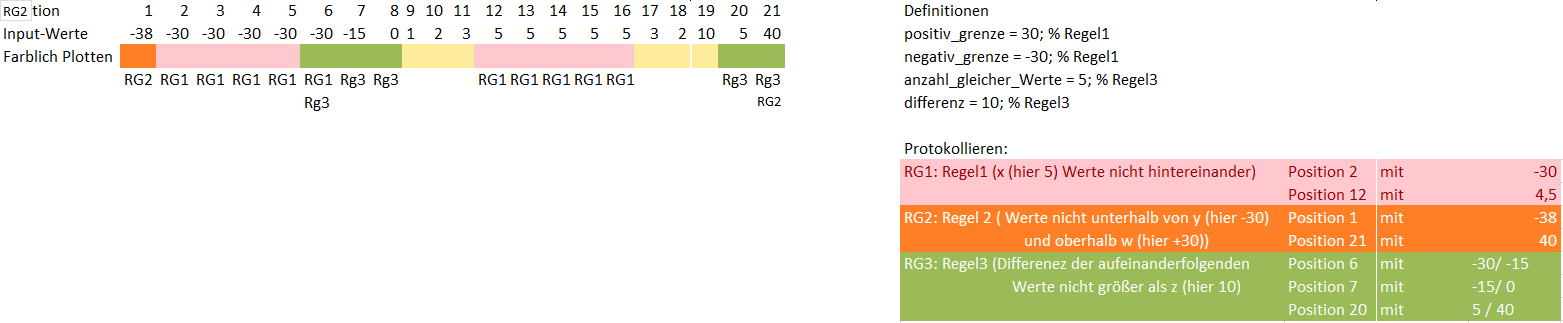 Das gewünschte Ergebnis, wie im Bild zu sehen, einmal eine Grafik erstellen, als Streifen und die gemachten regeln farblich kennzeichnen (mit Legende wie im Bild).
