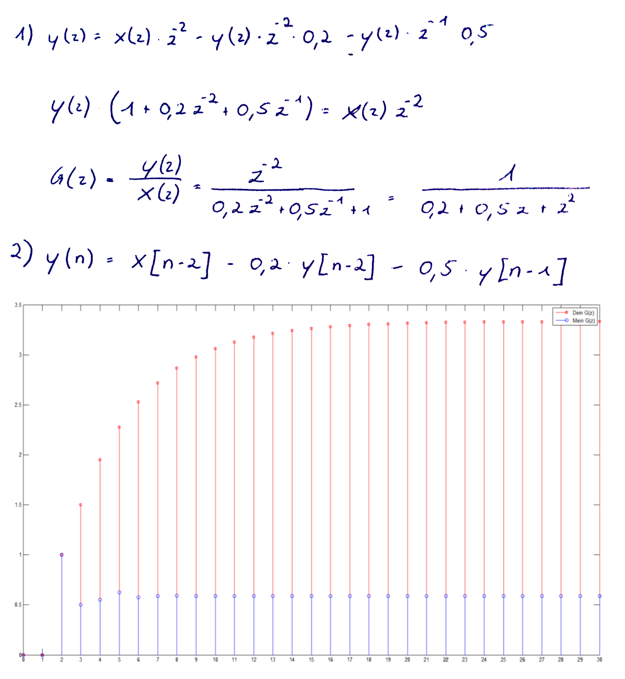 Du hast bei deiner Lösung der zweiten Teilaufgabe z^-2 bei x(z) vergessen, dann würde sich x(n-2) und nicht x(n) ergeben.