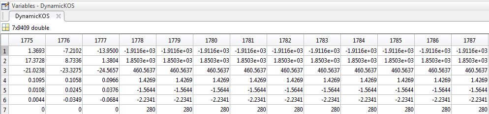 ich habe folgendes Problem: Ich habe mit einem optischen Messsystem Bewegungen gemessen und diese werden in Matlab als Variablen ausgegebenen. Gelegentlich kommt es vor, dass die Übertragung gestört wird. In Matlab ist das mit einem Eintrag des Wertes 280 in der 7. Reihe gekennzeichnet (siehe angehängte Abbildung, die 0 singalisiert "alles ok"). Um den Verlauf ohne diese gravierenden Messfehler vernünftigt darzustellen, müsste ich alle Spalten, die in der 7. Reihe eine 280 als Eintrag haben komplett löschen. Da die Dateien jedoch insgesamt gerne mal 10.000 Spalten sind, ist es per Hand einfach zu aufwendig.