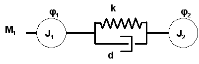 Ein Motor treibt eine Masse mit Trägheitsmoment J1 an, an der noch eine weitere Masse mit J2 über eine Feder k und einen Dämpfer d hängt, wie im Modell zu sehen ist.