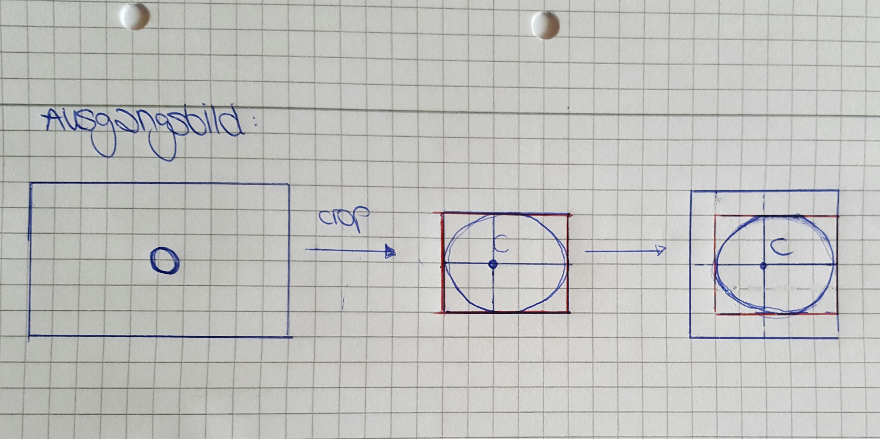 Hinzu kommt, dass nach dem Zuschneiden, so viel "hinzugefügt" werden soll, dass ein Quadrat entsteht, wo Centroid C die Bildmitte darstellt und ich am Schluss gleichgroße Quadrate habe (egal welche Größe bzw. welchen Radius mein Lichtpunkt hat).
