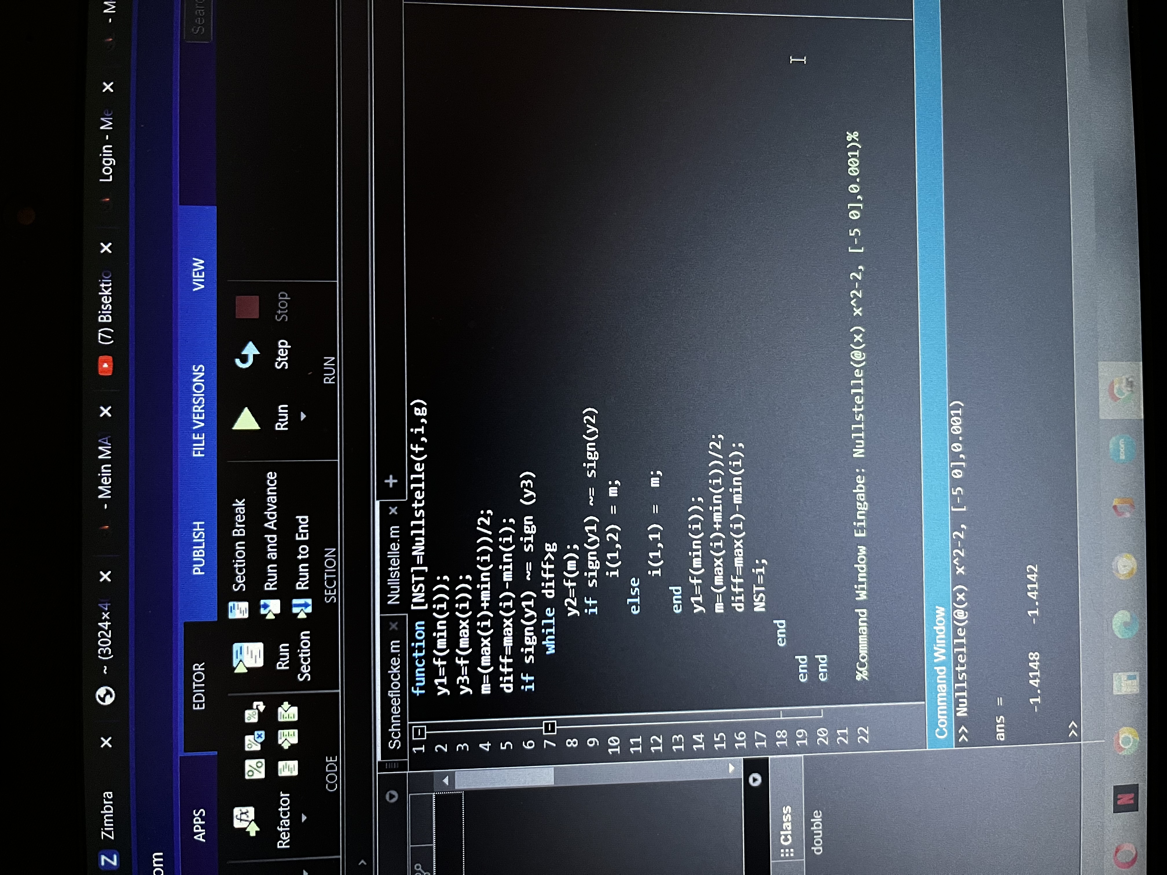 Hallo, ich versuche gerade ein Bisektionsverfahren zu programmieren, welches als Ausgabe die Nullstelle und ein Fehlerintervall hat.