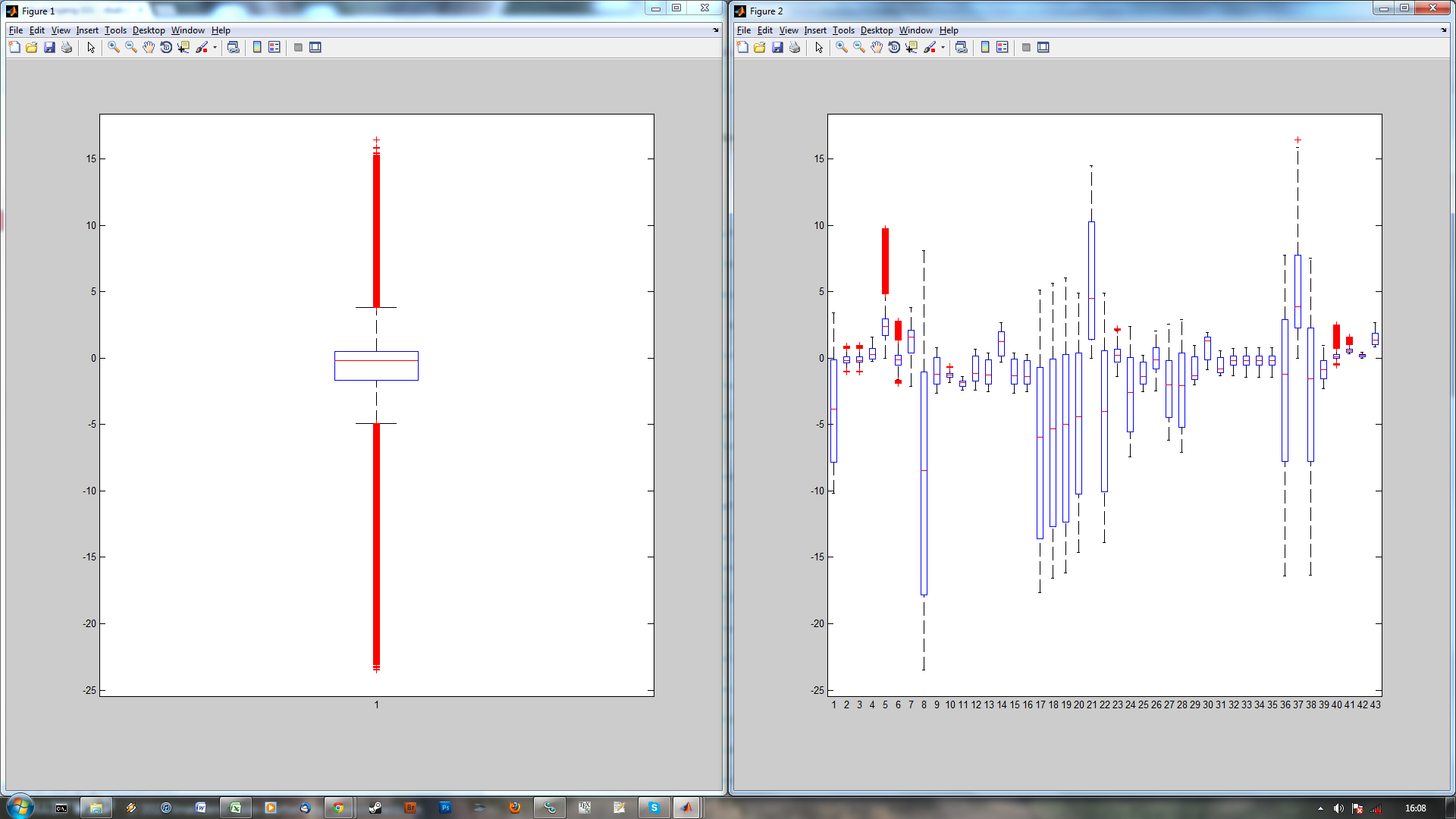 Ich hab gerade nur keine Ahnung wie ich das Anstellen soll. Laut der Matlab-Hilfe müsste mir der Befehl boxplot(M) maximal 48 Boxplots für eben eine Quellmatrix M liefern. Die Matrizen alle aneinanderzufügen wird auch nicht zum Ziel führen, da sie alle unterschiedlich groß sind.