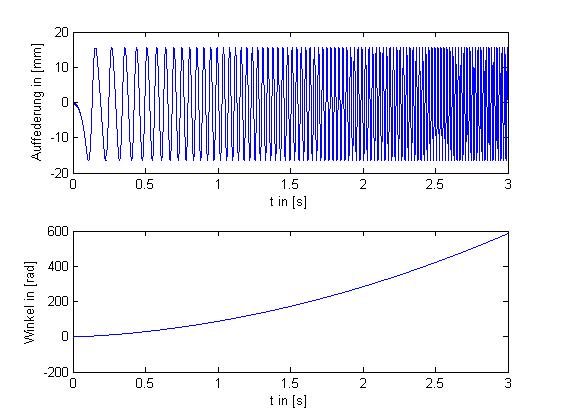 subplot(2,1,1),plot(t,x(:,1)*nor),xlabel('t in [s]'),ylabel('Auffederung in [mm]') subplot(2,1,2),plot(t,x(:,3)),xlabel('t in [s]'),ylabel('Winkel in [rad]')
