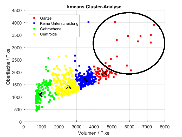 Ich möchte Objekte aufgrund der Oberfläche und des Volumens (Daten habe ich) in gebrochen, ganz, keine Unterscheidung und Centroids (Doppelt, hier ist ein Copy und Past Fehler in der Abbildung aufgetreten) unterscheiden.