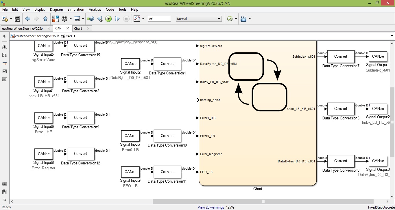 im Anhang findet ihr ein Stateflow Chart, das für eine Ansteuerung gedacht ist. Im Anhang 1 sieht ihr die Schnittstelle zwischen Interface und dem CAN-Bus, über die CANoe Blöcke speise ich die CAN Botschaften in das Stateflow Chart. Es geht mir hier gezielt um die Botschaften Error0_LB, Error1_HB, Error_Register und FEO_LB. Im Anhang 2 habe ich diese Botschaften als Conditionen genutzt (rot umrandet) um den Übergang von dem Zustand "Target_Velocity_1" nach "ActPos1_Response" einzuleiten und ein zweites Mal von "Delay11" nach "ActPos2_Response".