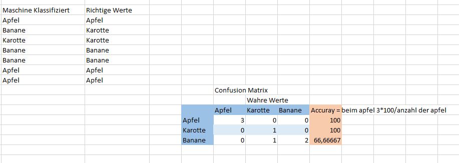 Es sollte z. B. in der ersten Spalte die Klasse Apfel file 1 darunter Klasse Apfel file 2 usw stehen und direkt daneben in der zweiten Spalte die passenden accuracies dazu