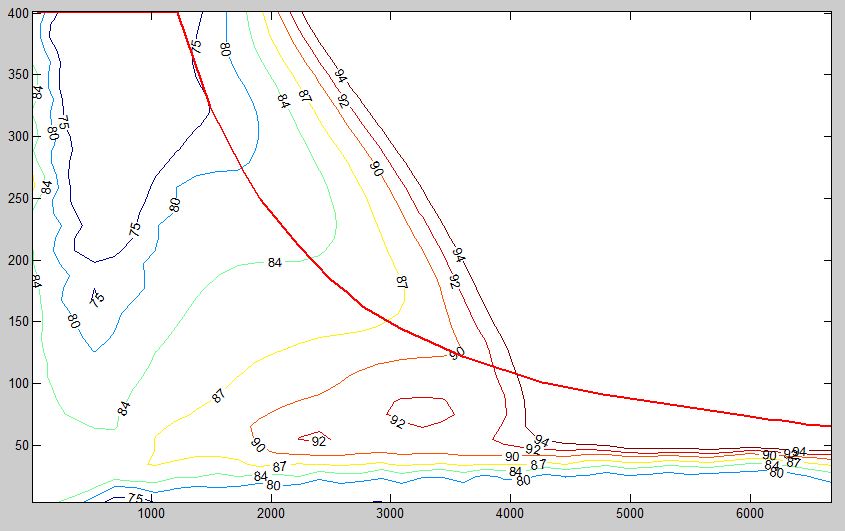 Der betreffende Plot befindet sich im Anhang. Es handelt sich um das Kennfeld eines Elektromotors. Die Betriebspunkte oberhalb der roten Linie sind nicht realisierbar (dienen nur zum Rechnen) und sollen deshalb im Plot auch nicht auftauchen. Es sollen nur die Höhenlinien unterhalb der roten Linie zu sehen sein. Kennt jemand eine elegante Lösung, um das zu bewerkstelligen?