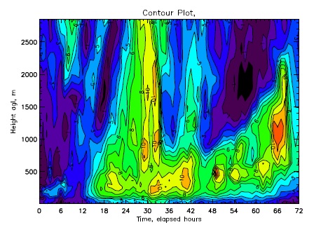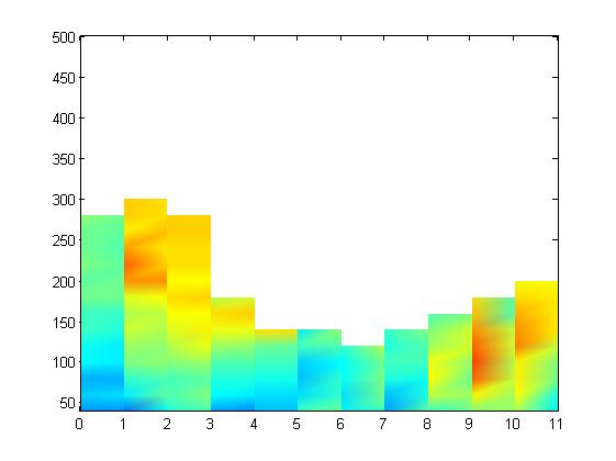 hast du eigentlich eine zusammenhängende Zeitreihe? Und was bedeuten denn dann die weissen Bereiche? Wurde da plötzlich in gewisser Höhe nicht mehr gemessen? Stehen da NaN in der Matrix Vh? Hast du beim Zusammenfügen der Daten etwas falsch gemacht? Das sieht mir total untypisch aus, dass da beim Übergang von einer Stunde zur nächsten das Bild komplett anders aussieht. Das sollte eigentlich von sich aus schon fließender sein. Ich vermute einfach, dass da irgendwas nicht ganz richtig ist....