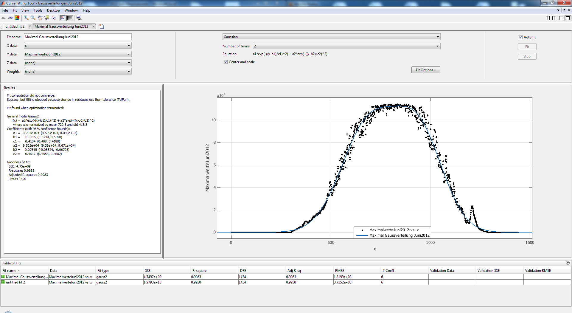 Ich habe eine Gauss-Funktion mit zwei Termen benutzt und Matlab gibt mir die 6 Koeffizienten als Ergebnis raus.