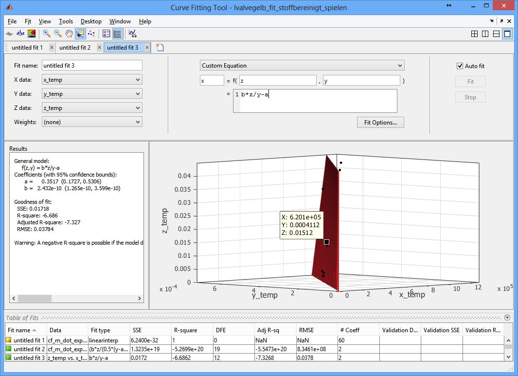 Ich nutze es um mit experimentell gewonnenen Daten die Optimierungskoeffizienten einer vordefinierten Gleichung aus der Theorie zu erhalten. Da ich jetzt schon viele Stunden probiert habe und nichts passte, habe ich die Gleichung erst einmal vereinfacht um das Problem zu finden.