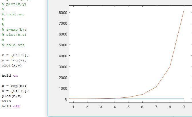 ich versuche die e-Funktion in sowie ihre Umkehrfunktion ln(x) in einen Graphen zu plotten. Bis jetzt habe ich es nur geschafft beide Funktionen in einer Figure darzustellen.