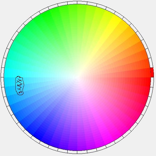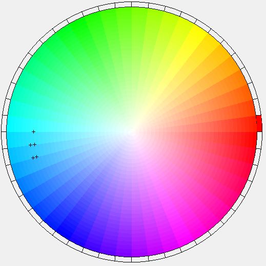 also ich hab mir das so vorgestellt, daß die h+s werte im farbkreis dargestellt werden (siehe anhnag, dort sind werte mit x markiert). das sollte dann eine "farbwolke" ergeben...