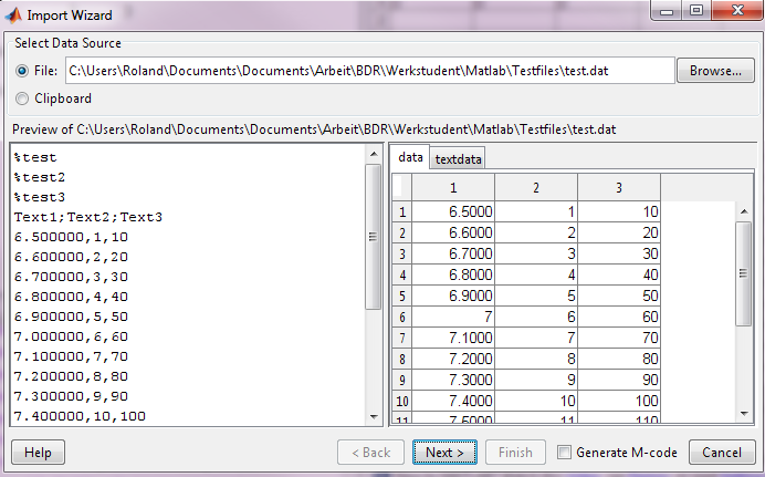 Wer kann mir da bitte helfen, die Datei einzulesen mit den richtigen Parametern? Weiterhin soll es später in eine GUI eingepflegt werden, in der man mehrere Dateien auswählt und nach Dateinamen=Arrayname speichert.