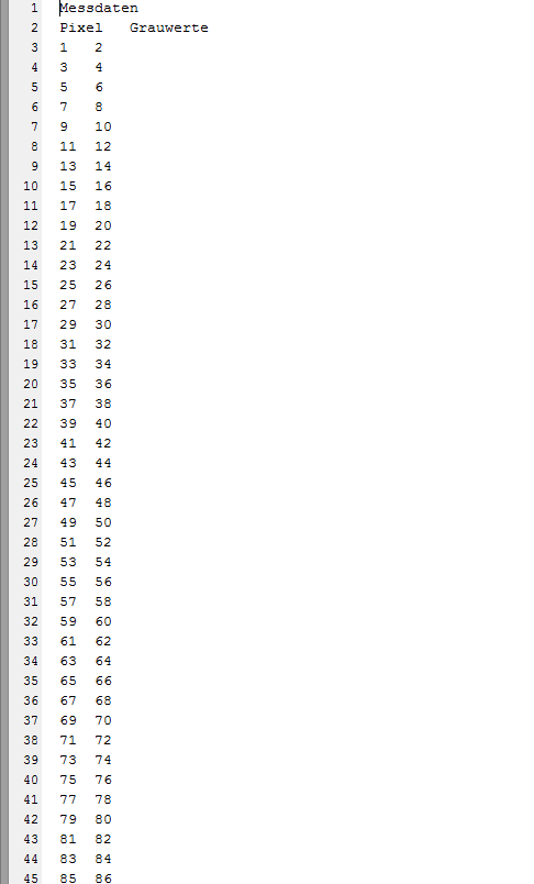 Die benötigten Daten sind schon richtig ausgewählt, jedoch werden mir nun erst die Pixel und dann die Grauwerte untereinander in der ersten Spalten angezeigt. Gewünscht ist aber, dass in der ersten Spalte die Pixel stehen und in der zweiten Spalte die dazugehörigen Grauwerte. Ich vermute, es liegt einfach an der Formatierung der vierten Zeile ('%i\n%g\n') aber ich habe auch schon andere Formatierungen gewählt, bin jedoch nie auf das gewünschte Ergebnis gekommen. Könnt ihr mir weiter helfen?