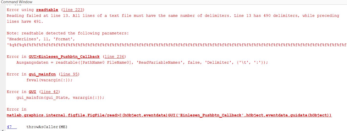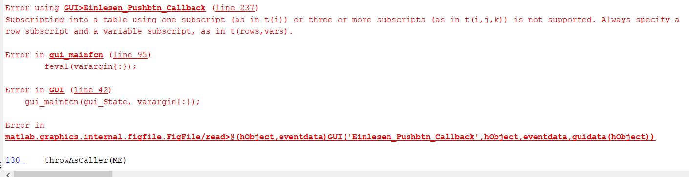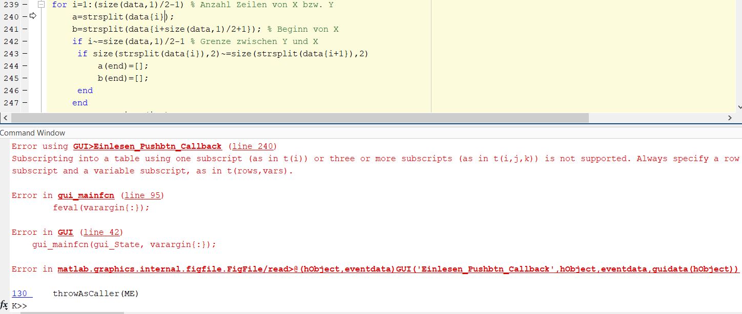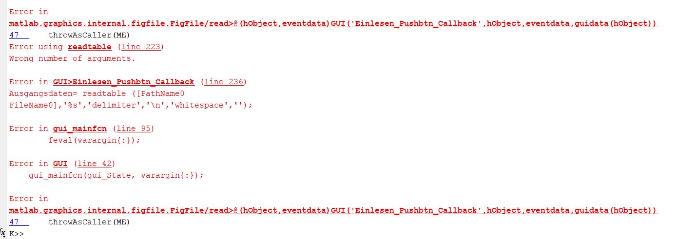 einfach den Befehl ersetzen reicht nicht. Du musst dich schon ein wenig mit der Syntax der Befehle auseinandersetzen. Insbesondere musst du bei readtable das '%s' weglassen, denn das erkennt das Format der Dateien automatisch. Das Ergebnis wird bei readtable auch ein Table sein und somit anders als von textread.