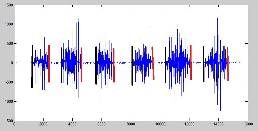 Matlab wird vermutlich für alle Onsets einen x-Wert berechnen und für alle Offsets einen zweiten x-Wert. Daraus ergibt sich ein Intervall (Bsp: im Bild "On-Offset": x-schwarz(onset) und x-rot(offset). Aus diesem Intervall möchte ich dann die median Frequenz berechnen bzw das RMS.