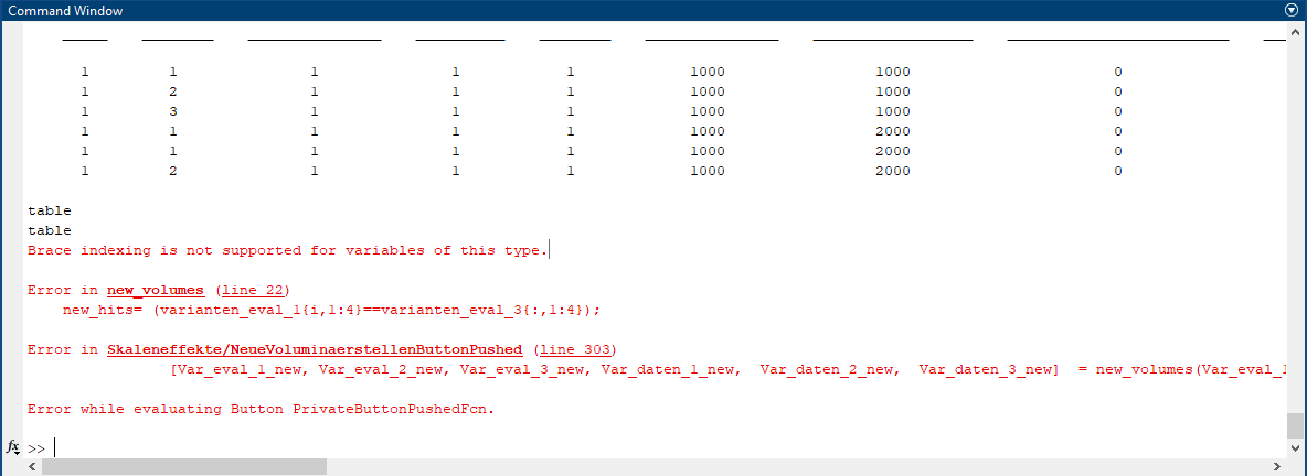 leider komme ich bei meinen Funktionen nicht weiter. Ich habe eine Funktion erstellt, die als Input eine Tabelle benötigt. Dies funktioniert auch einzeln, wenn ich die vorgefertigte Tabelle benutze. Wenn ich vorher jedoch die Tabelle mit einer zweiten Funktion bearbeite, die lediglich weitere Zeilen hinzufügt, erkennt Matlab diese nicht als Tabelle an und bemängelt, dass das Brace Indexing nicht für den Datentyp erlaubt ist. Bei Abfrage erhalte ich als Datentyp jedoch Table, weswegen ich nicht weiß, warum Matlab ein Problem hat. Hatte jemand schon mal ein ähnliches Problem? Ich habe die Fehlermeldung als Bild angefügt.