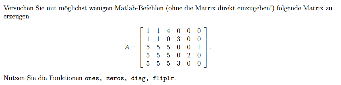 Hallo Leute, im Anhang hab ich ein Screenshot einer Matrix die ich in MatLab erstellen soll. Ich bin totaler Anfänger mit MatLab und weiß leider nicht wie ich da genau anfangen soll.