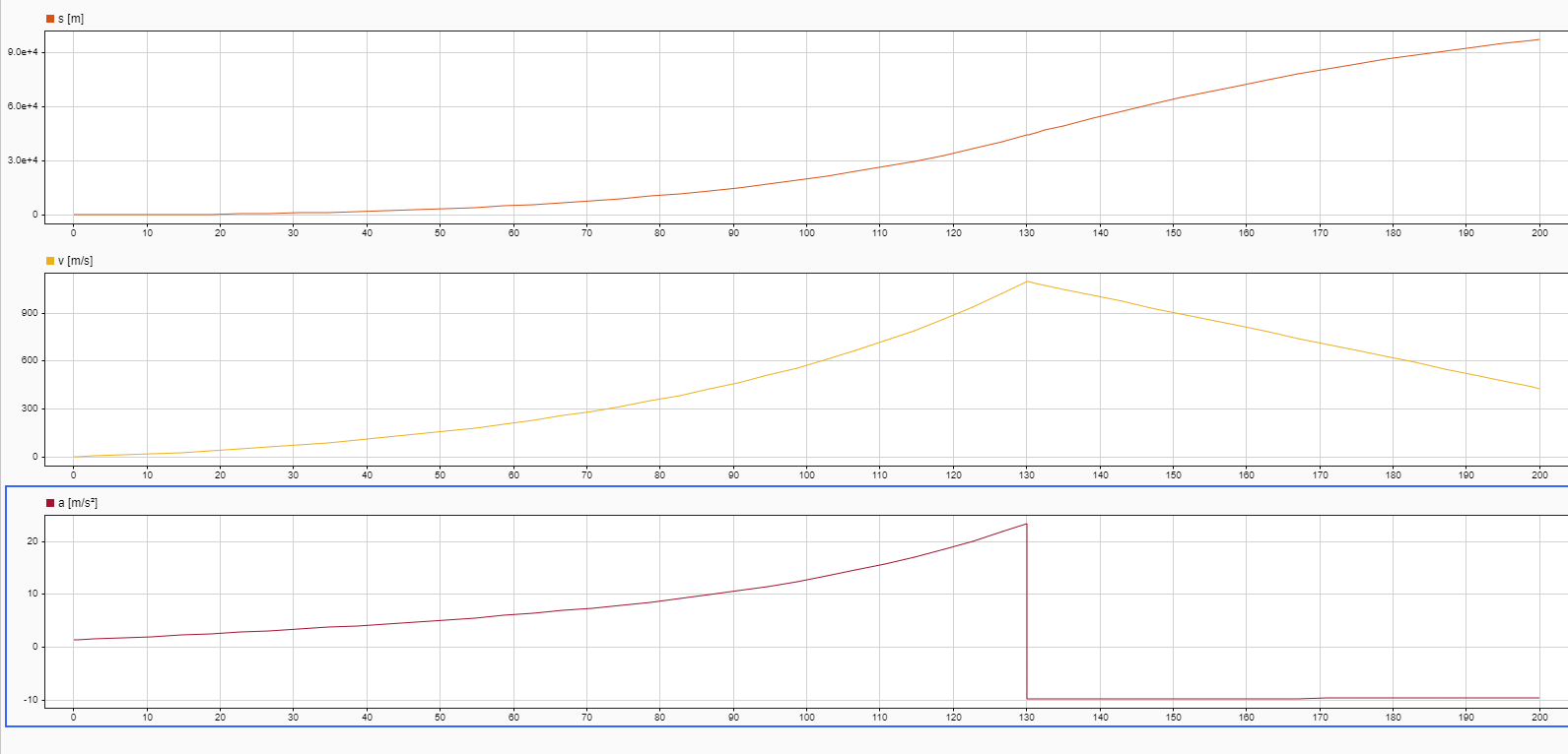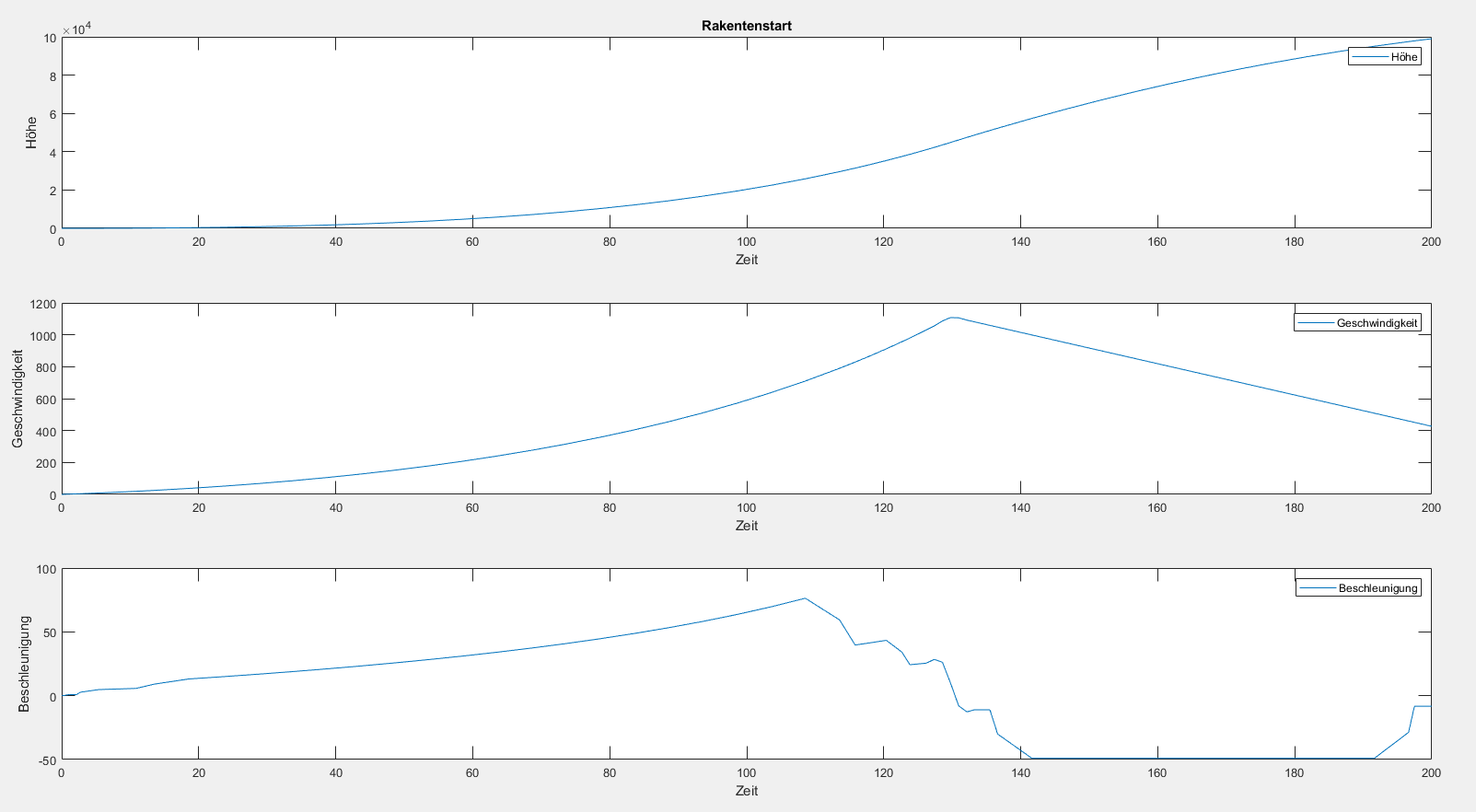 Ich habe das ganze über ode45 versucht, der Plot zeigt aber nur für Höhe und Geschwindigkeit einen vernünftigen Wert an.