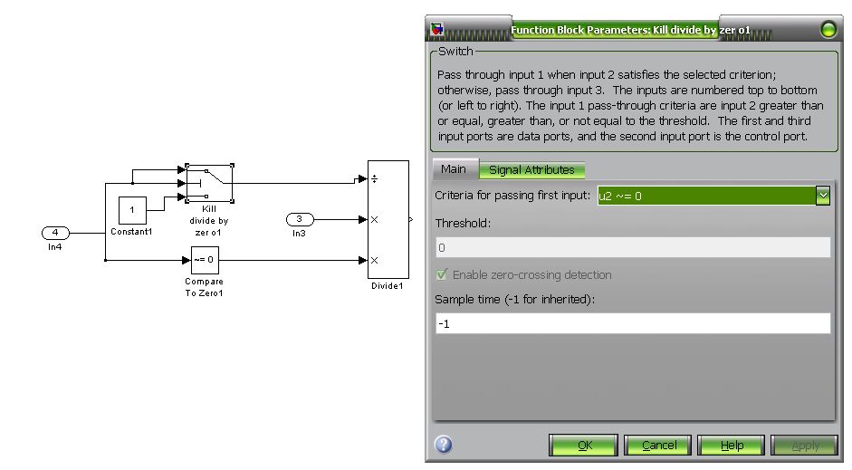 Die Division durch Null abfangen, in dem man vor der Rechnung die Größe von 0 auf einen kleinen Wert abändert. Also die Größe mit einem Konstantblock mit z.B. c = 1e-9 addieren.