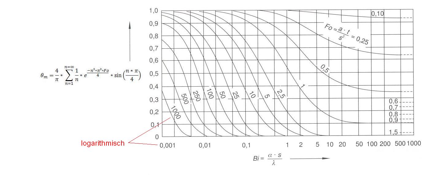 θ_m=4/pi*∑_(n=1)^(n=∞)_(1/n*e^((-n²*pi²*Fo)/4)*sin((n*pi)/4))