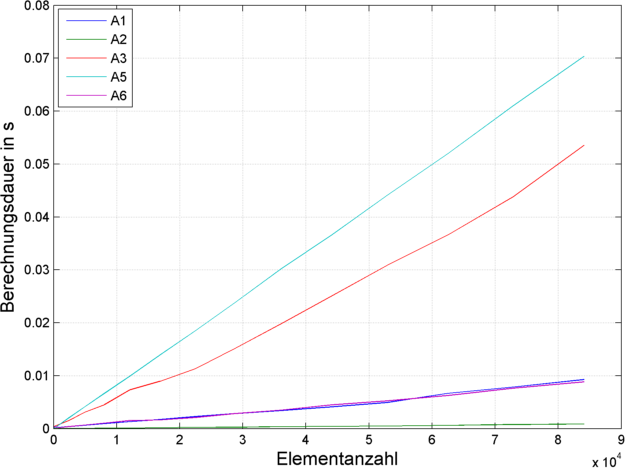 Ich habe einmal für alle Varianten, außer A4, da dort die Zeit zu groß ist, die Berechnungszeiten bestimmt. Dabei stellte sich heraus, dass A6 in etwa genau so schnell ist wie A1. Für kleine Elementanzahlen ist A5 sehr schnell, wird jedoch dann zu langsam. Keine Variante kommt an A2 heran