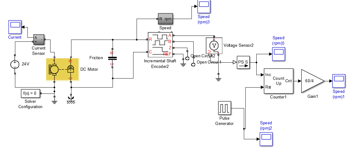 ich habe mit Hilfe von Simscape einen DC-Motor simuliert und die RPM mit Hilfe von einem Encoder ermittelt. Der Encoder generiert 4 Pulse pro Rev.. FÜR Decoding habe ich die fallenden Flanken von Port A gezählt mit Counter UP. und den Counter wird jede Sekunde (Zeitinterval) auf Null gesetzt mit Hilfe von Pulse Generation. Die Anzahl der Pulses pro Sekunde wird durch 4 (4 Pulses pro rev )geteil und multipliziert * 60 (von sec zu Minute).