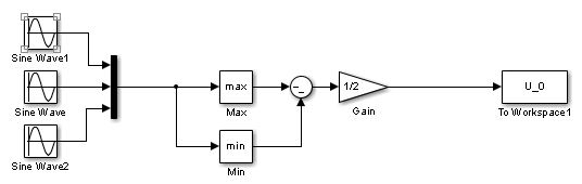 Nun möchte ich die drei Verläufe zusammenfügen wie in Simulink mit dem Block "Mux" und dann die maximal- und minimal-Werte für jeden Punkt mir anzeigen lassen.