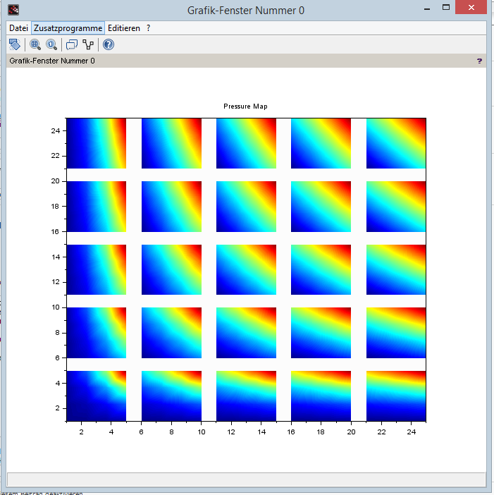 ich möchte gerne mit Scilab eine Druckverteilung darstellen. Ich habe also 25 Werte von sensorischen Flächen (4x4cm) und eine gesamte Fläche von 26x26cm. Den darauf einwirkenden Druck möchte ich verschieden farbig in einer Grafik darstellen.