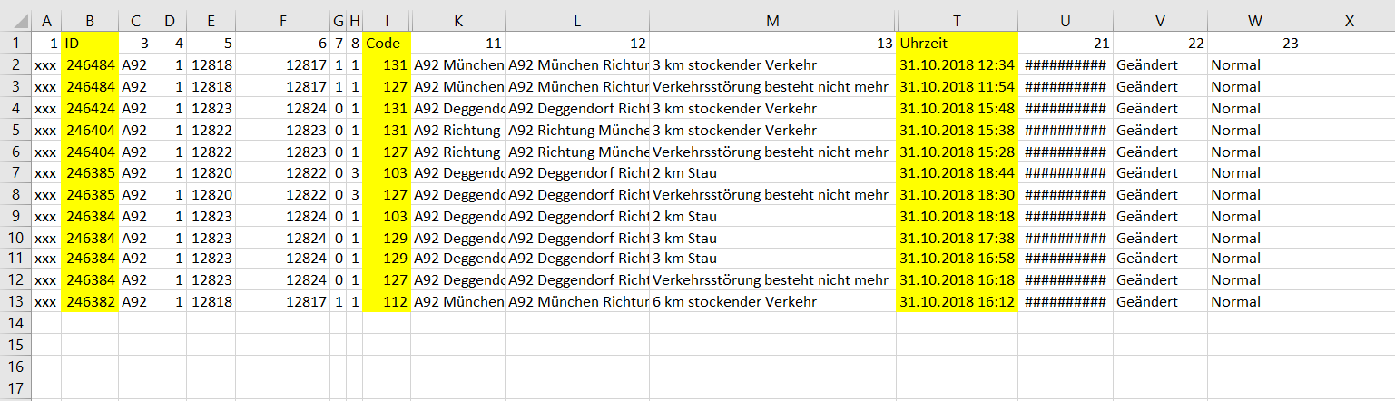 | Hier ein Bild der Datei, mit den gekennzeichneten Spalten, Uhrzeit, ID und Code. |