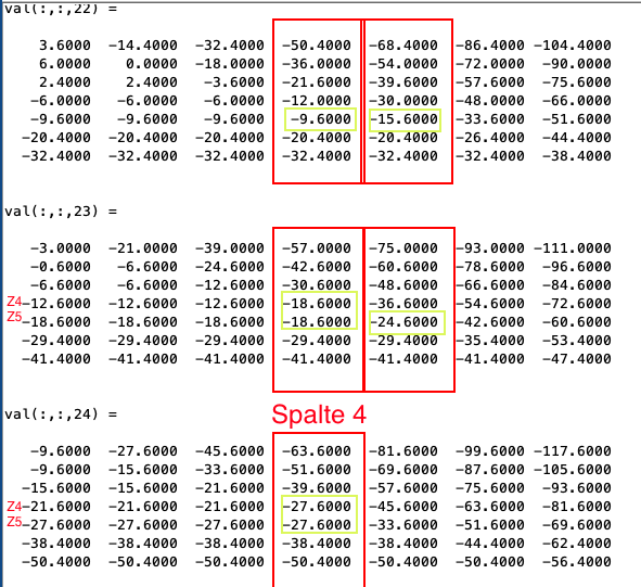 Bei Matrix (:,:,24) wird Spalte 4 untersucht. Diese liefert in Zeile 4 und Zeile 5 einen Maximalwert.