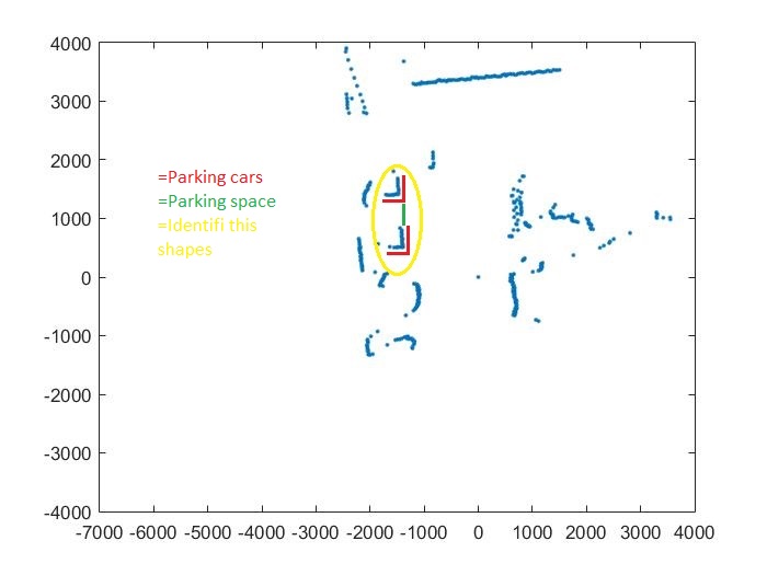 ich habe wie auf dem Bild zu sehen eine Punktwolke und möchte ganz gerne dass Matlab die in rot gezeichneten ecken erkennt und ich somit weiß dass dort eine Parklücke ist.