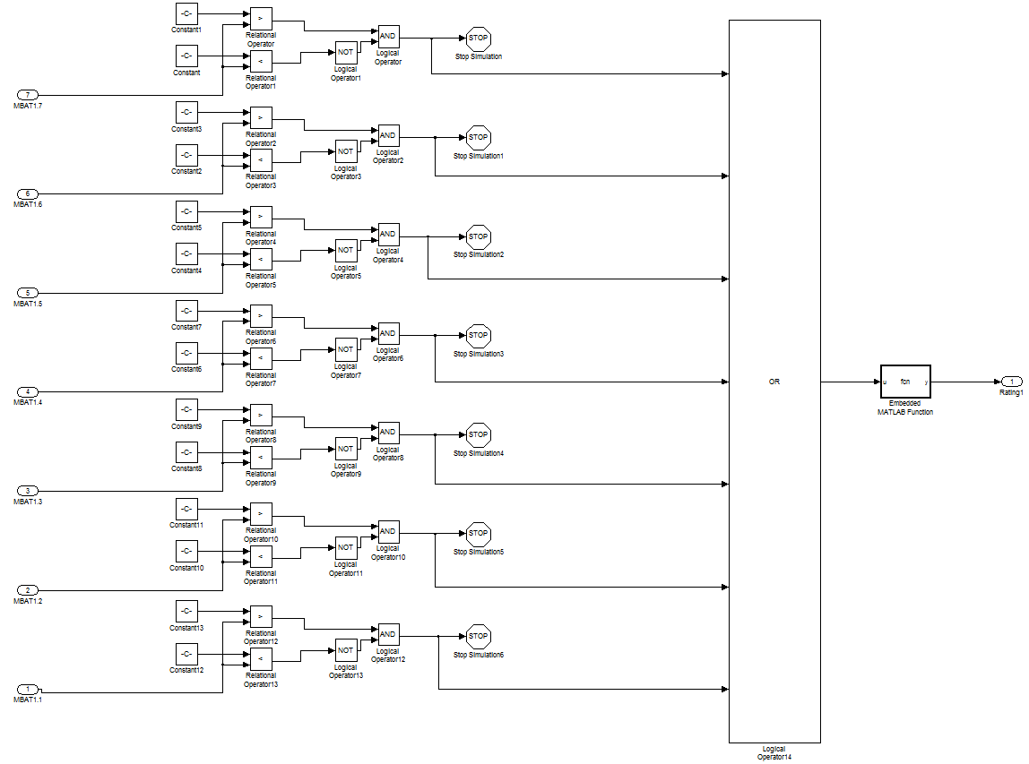 Ist eine dieser Spannungen größer oder kleiner als der geforderte Wert so wird der Eingabewert der Embedded Matlab Function geändert und in dieser soll eine Fehlermeldung generiert werden.