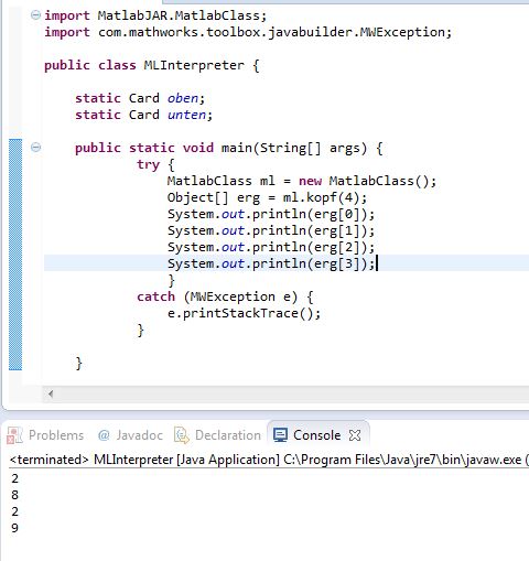 Also ich habe folgendes Problem: Ich habe eine Matlabfunktion in Java eingebunden (works) und diese in Java aufgeführt (works). Die Matlabfunktion hat 4 Ausgabewerte, hier der die Funktion in kurz: