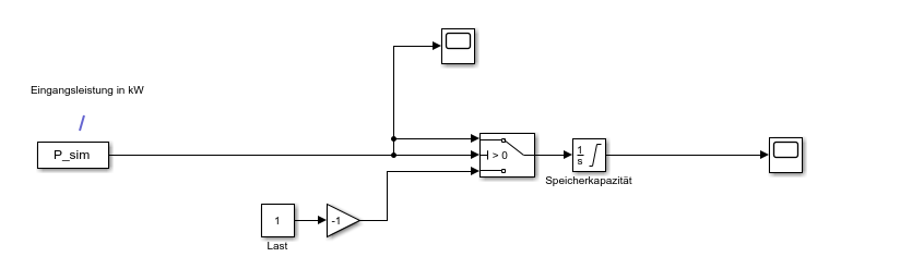 Der "Integrator Limited" ist schonmal das was ich brauche. Nun ist es mir allerdings nicht gelungen, die Entladung darzustellen. Bisher zeigt es mir nur den ersten Ladevogang an und dann bleibt der Speicher voll. Wie kann ich es denn realisieren, dass wenn der Entladezustand zutrifft (1), Schrittweise meine Speicherenergie um eine konstante Last abnimmt?