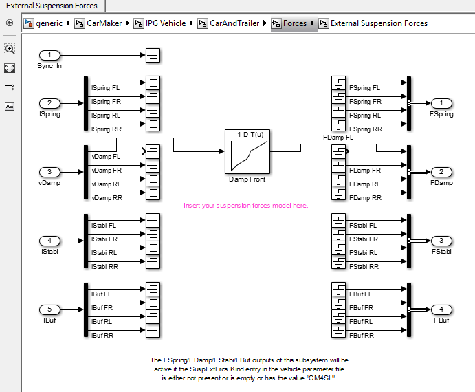 Also starte ich Matlab und öffne "generic.mdl" und navigiere zu CarMaker-->IPG Vehicle--> CarAndTrailer--> Forces --> External Suspension Forces