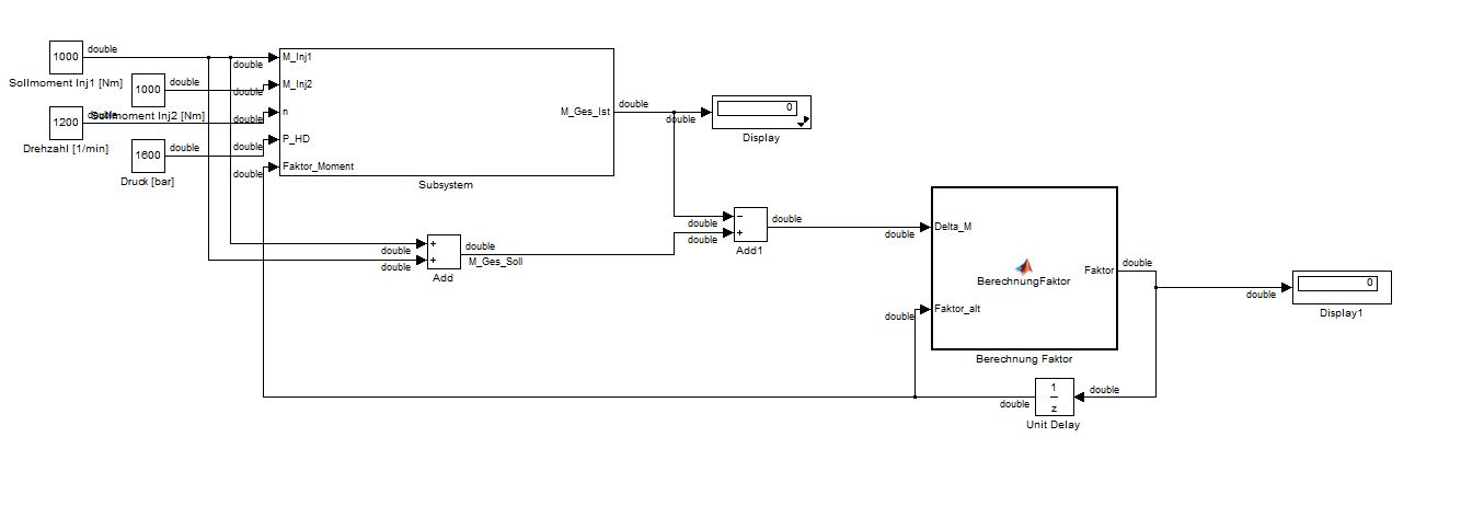 soll auf Basis der Differenz dieser Werte ein Faktor berechnet werden, der mit einem der Werte multipliziert wird, sodass diese sich nach und nach angleichen bis sie möglichst identisch sind. Das Simulink Modell ist in screen1.jpg (Anhang) zu sehen. Dieses vereinfachte Modell funktioniert auch genau so wie es soll.