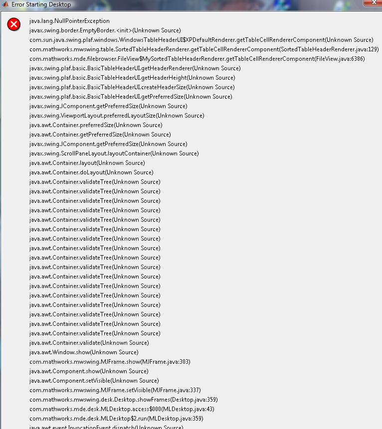 Wenn ich nun Matlab starte, dann bekomme ich sofort ein riesiges Fehlerfenster mit dem Inhalt: