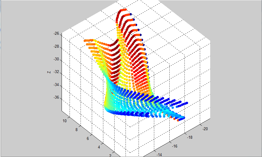 Die Koordinaten wurden u.a. von einem CAD Modell ausgelesen. Die restlichen Daten wurden dann berechnet. Es entstehen XYZ Koordinaten in Abhängigkeit von den ausgelesenen Punkten auf der Kante des Zahns und in Abhängigkeit von der Verdrehung der Verzahnung.